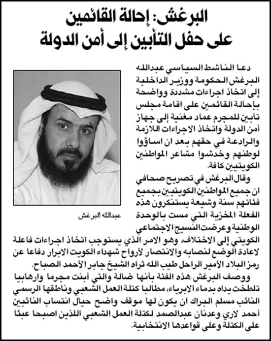 بدماء الابرياء، مطالبا كتلة العمل الشعبي وناطقها الرسمي النائب مسلم البراك
