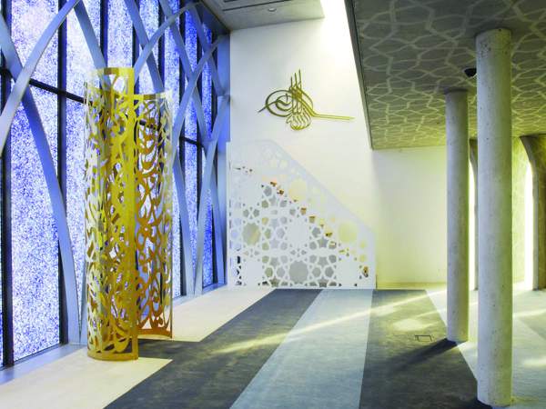 وعلى مدخله آيات قرآنية مكتوبة باللغة العربية مع معانيها بالألمانية.